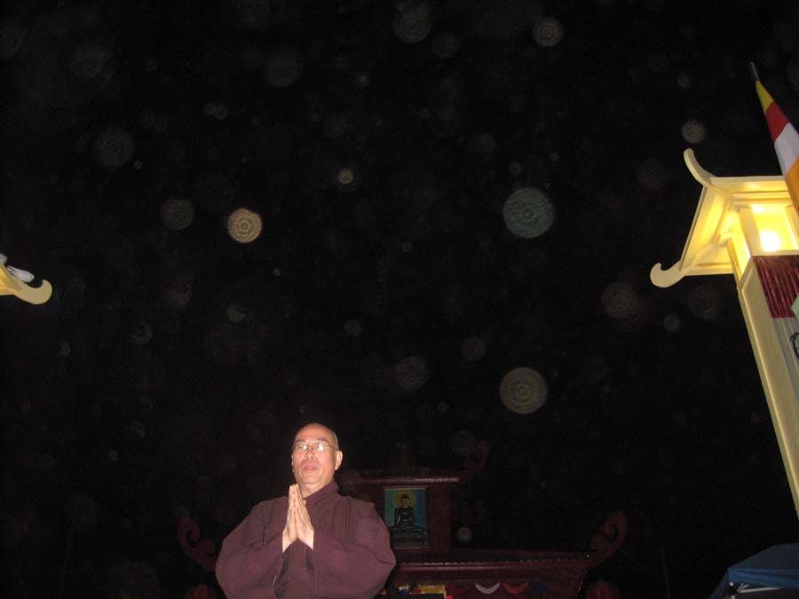 Cùng cái máy này ( tôi click trong buổi lửa trại của VNg ở Bảo Lộc) , sau cơn mưa, chỉ có một nguồn sáng là đống lửa và cái máy tôi có ống kính loại xoàng, đã vậy không chịu lau chùi cho sạch và trong vắt để tránh hiện tượng "phân cực"..nên anh chị xem sự thể:Cảm ơn anh chị chịu cho tui trình bày ..tdhHinh 16Hình 17Hình 18Hình 19Hình 20Hình 21Hình 22Hình 23Hình 24Hình 16, 17 do học sinh chụp trong ngày lễ hội truyền thống (Heritage Festival) các dân tộc của Trường Tung Học Wakefield, Arlington,Va vào tháng 3/2010, hình cho thấy có nhiều hoa, không dính dáng gì đến tôn giáo, đến Phật ngọc, đến Bồ Tát Quán Thế Âm.Hình 18, 19 chụp tại tư gia của cố nhạc sĩ Ngô Mạnh Thu, hình 20 chụp tại Tổ đình Vĩnh Nghiêm Hải Ngoại, hình 21 chụp tại chánh điện Trung tâm Phật Giáo Vạn Hạnh New Orleans, hình 22 chụp tại tư gia nhạc sĩ Ngô Mạnh Thu, hình 23, 24 chụp tại Tu Viện Pháp Vương.Hình 25Không cứ gì người Việt chụp mới có hoa hay đốm trắng ấy, người Mỹ chụp vẫn có và người ta đã giải thích do nhiều lý do, một là do bụi, mắt thường không thấy nhưng máy ảnh chụp được do có sự phản chiếu qua đèn (flash), nhất là đèn gắn sẵn trong máy ảnh, người ta thí nghiệm, đặt máy trên chân máy, hướng máy lên bầu trời tối, tung bụi lên rồi chụp có đèn, kết quả góc tung bụi có nhiều đốm trắng như hình dưới (h. 26).hình 26Ngoài ra còn do những hạt mưa nhỏ cũng làm phản chiếu ánh sáng, ống kính bị giọt nước rơi vào ...Nhận xét của Trần Đình Hùng, tôi cho là đúng một phần, không chắc là do ống kính bị dơ vì ống kính NIKKOR tôi mới nhận được, lắp vào máy chụp vẫn có hiện tượng hoa ở hình 11 & h12, anh nào đó đặt tên là Hoa Muối, có lẽ lấy kinh nghiệm nhà nông, vào khoảng tháng 4 tháng 5 ta, có sương muối trồng trọt rau, nhất là rau muống không tốt, nên anh ta cho là Hoa Muối do sương muối mà có.Nói chung do môi trường có nhiều bụi, máy ảnh chụp có đèn nền tối, nên có những đốm trắng, gọi là hoa muối, Hoa Mạn Đà La hay hoa chi cũng được, những nhiếp ảnh gia có những bức ảnh nghệ thuật, họ đã phải dày công sáng tạo cho đạt các mặt kỹ thuật, mỹ thuật ... một bức ảnh Phật hay Bồ Tát chụp được như hình 1, 2 và 24 làm cho bức ảnh có ý nghĩa như là có chư Thiên tung hoa cúng Phật.
